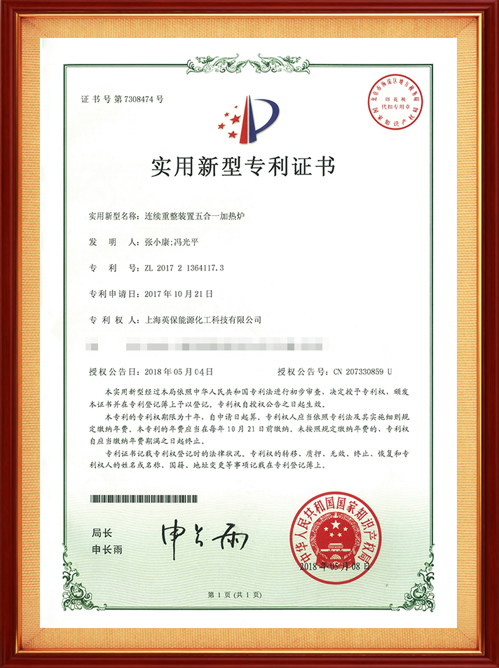热烈祝贺我公司《连续重整装置五合一加热炉》、《竖琴型加热炉》、《L型废酸裂解炉》三项实用新型专利同日获得知识产权局授权。此三项专利于2017年10月申报,并在2018年5月4日同日获得实用新型专利证书。