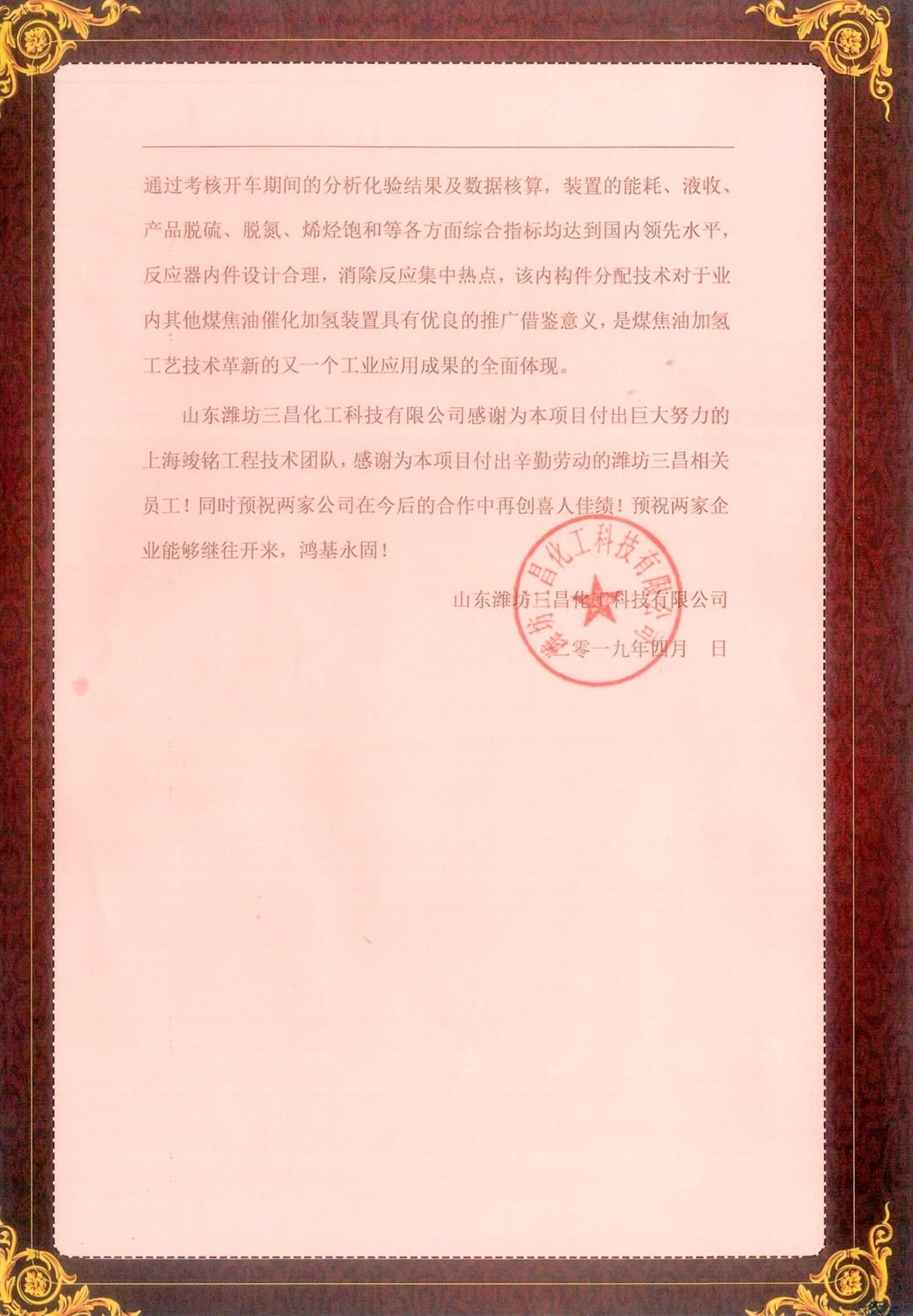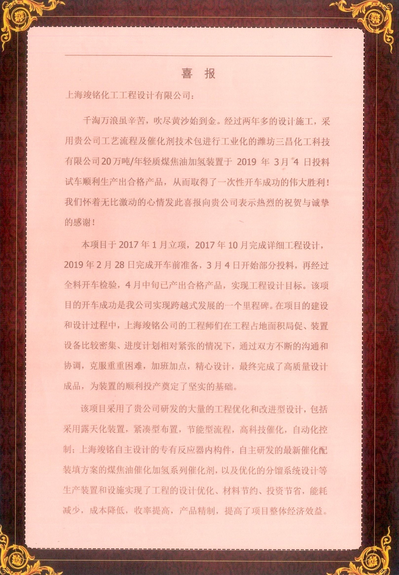 千淘万浪虽辛苦,吹尽黄沙始到金。经过两年多的设计施工,采用贵公司工艺流程及催化剂技术包进行工业化的潍坊三昌化工科技有限公司20万吨/年轻质煤焦油加氢装置于 2019 年 3月 4 日投料试车顺利生产出合格产品,从而取得了一次性开车成功的伟大胜利!我们怀着无比激动的心情发此喜报向贵公司表示热烈的祝贺与诚挚的感谢!
