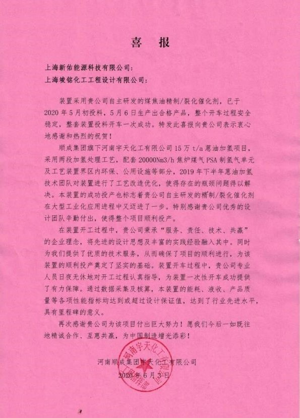 顺成集团旗下河南宇天化工有限公司15万吨/年蒽油加氢项目,采用两段加氢处理工艺,配套20000Nm³/h焦炉煤气PSA制氢气单元及工艺装置界区内环保、公用设置等部分,2019年下半年蒽油加氢技术团队对装置进行了工艺改造优化,使得存在的瓶颈问题得以解决。该装置的成功投产也标志着8025威尼斯(Macau)官网-Unique Platform和上海竣铭化工工程设计有限公司自主研发的精制/裂化催化剂在大型工业化应用进程中又迈进了一步。