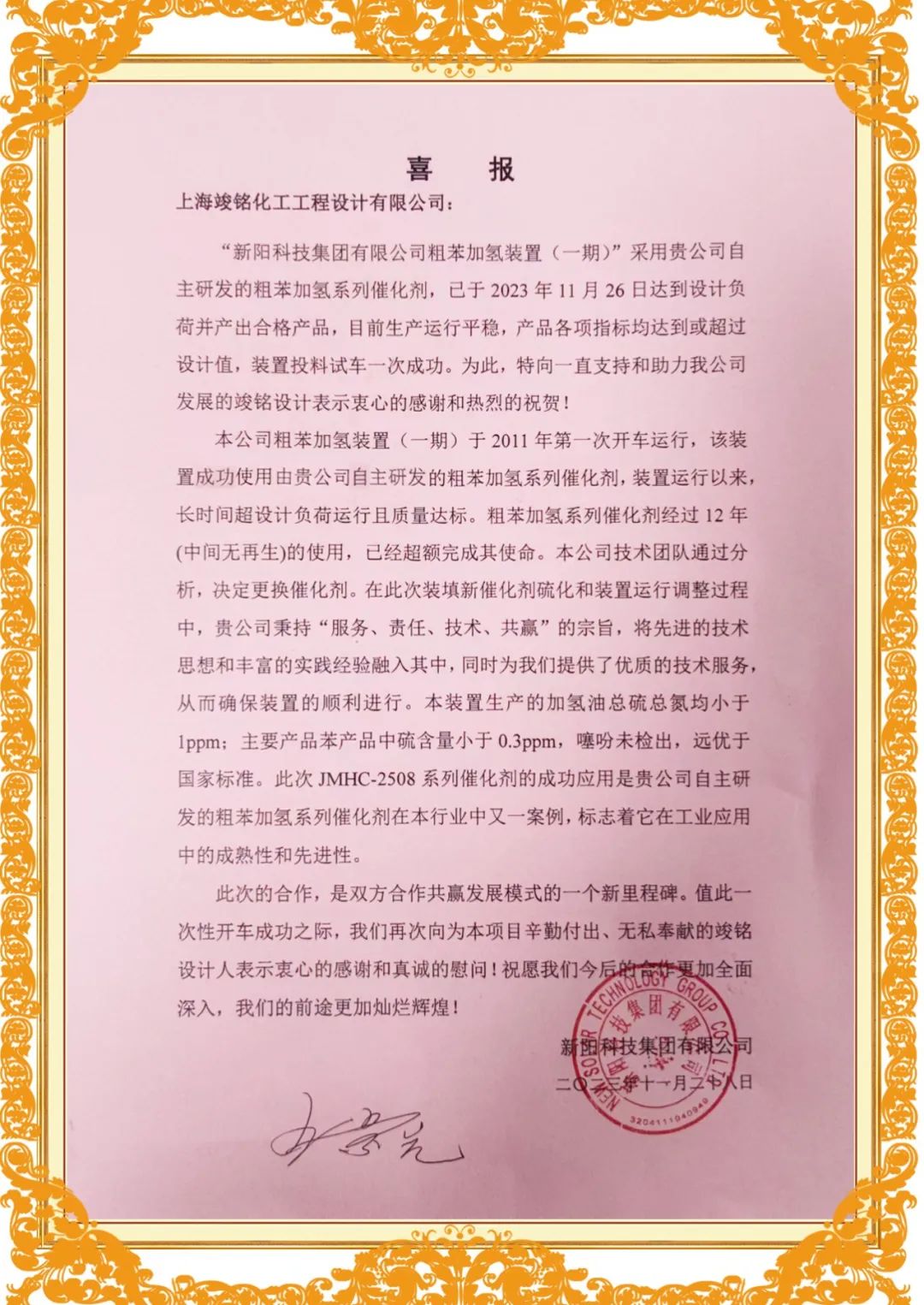 业主发来喜报表示:自2011年第一次开车运行至今,装置长时间超设计负荷运行且质量达标,粗苯加氢系列催化剂更是经过12年的使用,超额完成其使命。经技术分析,决定更换催化剂,将先进的技术和丰富的实践经验融入其中,在原有的装置基础上提供了优势的技术服务。通过考核开车期间的分析结果及数据核算,装置生产的加氢油总硫总氮均小于1ppm;主要产品本产品中的硫含量小于0.3ppm,噻吩未检出,这些数据均优于国家标准。此次开车成功应用的是竣铭设计自主研发的JMHC-2508系列催化剂,标志着JMHC-2508系列催化剂在工业应用中的成熟性和先进性。