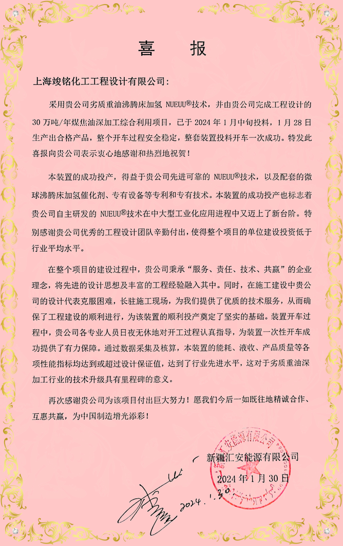 业主感谢在装置开车过程中,公司各专业人员日夜无休地对开工过程认真指导,为装置一次性开车成功提供了有力保障。在一次次地数据采集及核算,本装置的能耗、液收、产品质量等各项性能指标均达到或超过设计保证值,达到了行业先进水平。