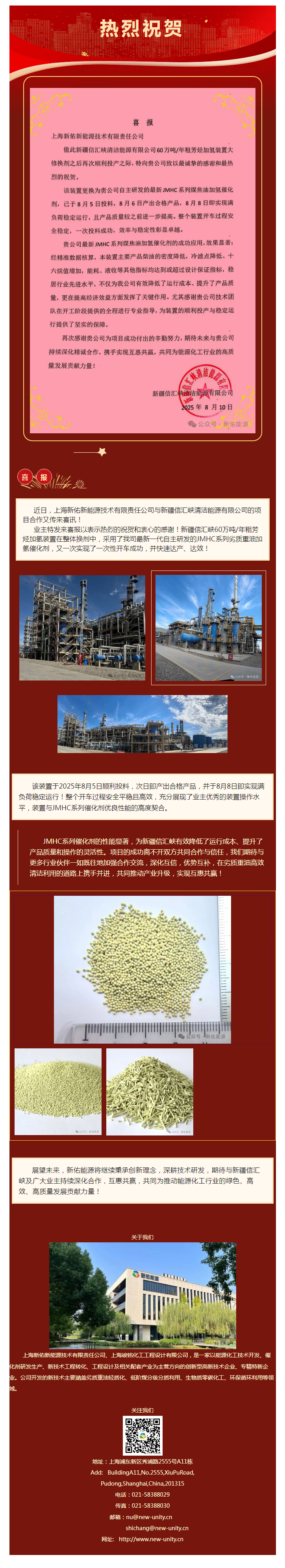 【8025威尼斯&竣铭】热烈祝贺新疆信汇峡60万吨/年粗芳烃加氢装置采用8025威尼斯能源JMHC系列催化剂再次投料开车成功!